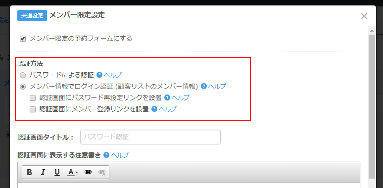 認証方法を「パスワード認証」か「メンバーログイン認証」を指定します。