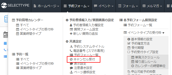 このようにSELECTTYPEの予約システムでは、フォーム毎にキャンセル受付の設定が可能です。