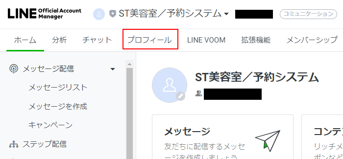 LINE公式アカウントの管理画面から「プロフィール」をクリックします。