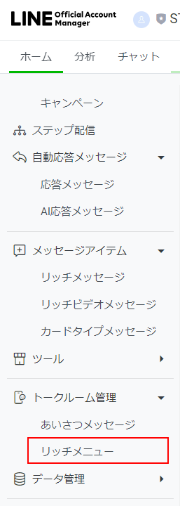 LINE公式アカウントの管理画面ホームのサイドメニューから「トークルーム管理」→「リッチメニュー」をクリックします。