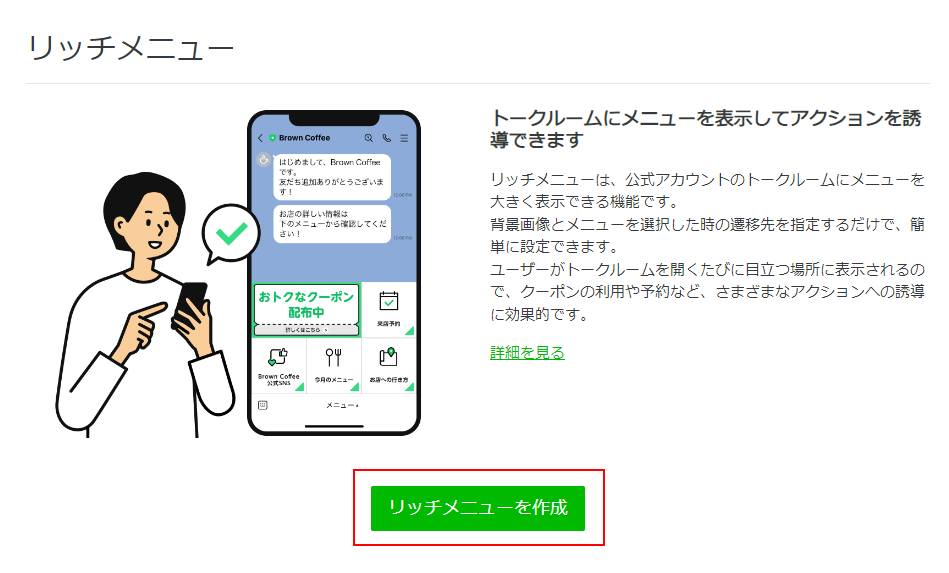 リッチメニュー設定画面の「リッチメニューを作成」をクリックします。