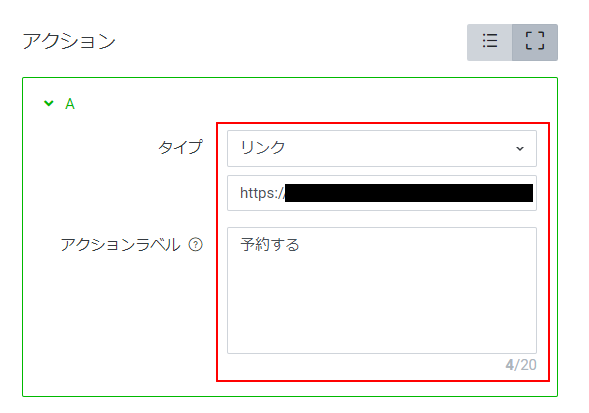 アクションではタイプを「リンク」にしてURL入力欄には予約フォームのURLを入力します。