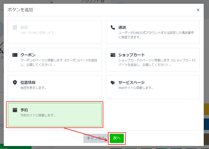 ボタン追加画面が表示されます。「予約」を選択して「次へ」をクリックします。