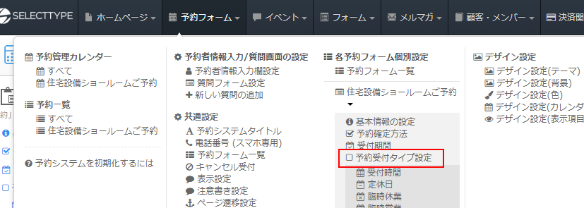 管理画面のヘッダーメニューより目的の予約フォームの「予約受付タイプ」を選択します。