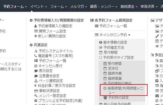 ページ上部ヘッダーより、「予約フォーム」→各予約フォーム個別設定の営業時間タイプの予約フォーム「接客時間/利用時間メニュー」をクリックします。