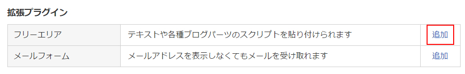 画面下部にある「拡張プラグイン」の「フリーエリア」の「追加」をクリックします。