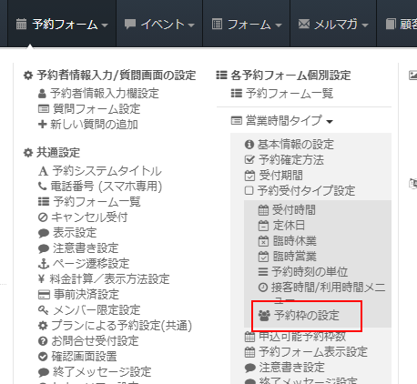 営業時間タイプの「予約枠の設定」では予約枠に関する以下の設定をすることが出来ます。