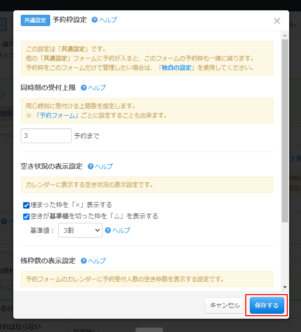 ・残枠数の表示設定 … 予約枠に残りに枠数を表示するかどうかや、単位の設定が可能です。