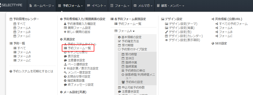 SELECTTYPEの予約システムでは複数の予約フォームを作成することが出来ます。