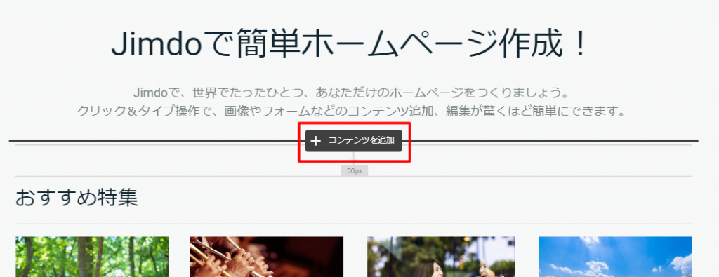 Jimdoのホームページ編集画面から「コンテンツを追加」をクリックします。