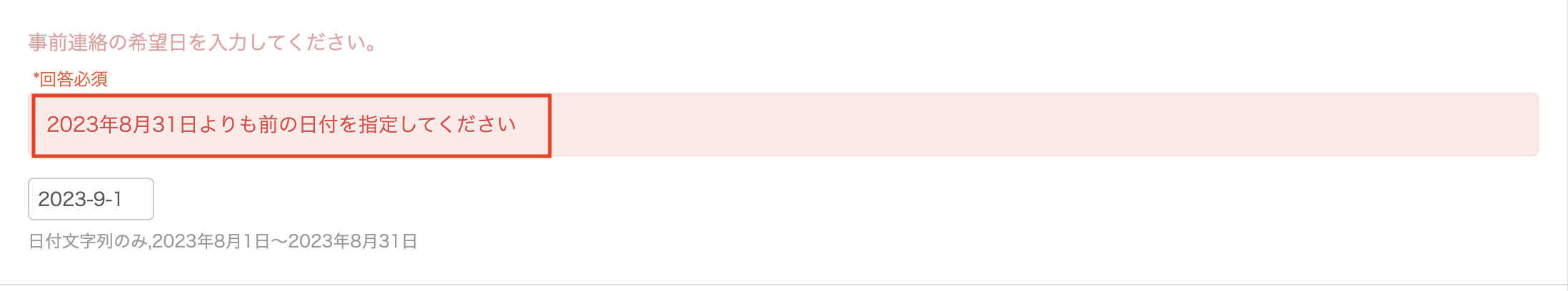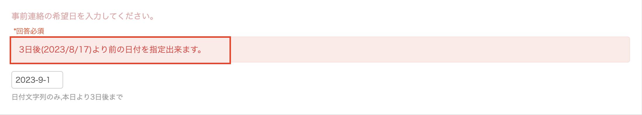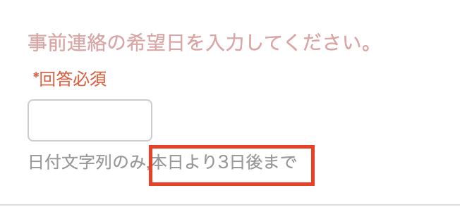 例えば、期間限定ショップのため「2023-8-1」から「2023-8-31」の期間のみを入力可能としたい場合などに本設定を活用いただけます。