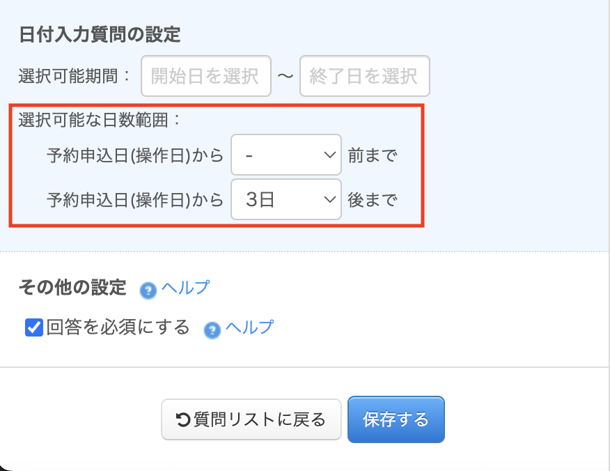 選択可能な日数範囲の設定で日付を入力すると、予約受付日の前後◯日の日付のみ入力ができるようになります。