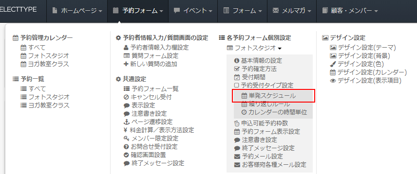 ログイン後にページ上部ヘッダーより、「予約フォーム」→「各予約フォーム個別設定/単発スケジュール 」をクリックします。