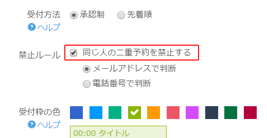 同一単発スケジュールや同一日付のルール枠に同じメールアドレスや電話番号で重複予約を禁止指定することができます。