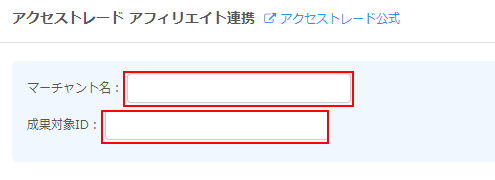 続いてアクセストレードで入手した「マーチャント名」「成果対象ID」を入力します。
