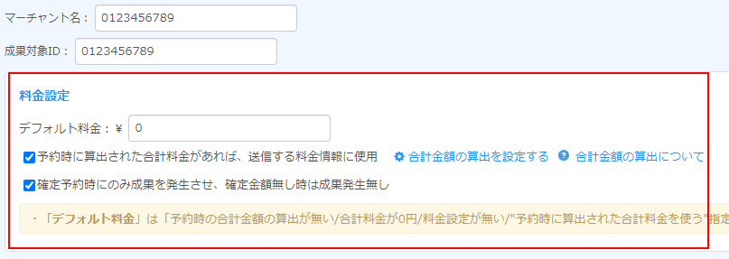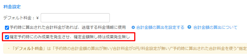 デフォルト料金を指定して、「予約時に算出された合計料金があれば、送信する料金情報に使用」「確定予約時にのみ成果を発生させ、確定金額無し時は成果発生無し」の指定を外しますと、いずれの予約もデフォルト料金で指定されるようになります。