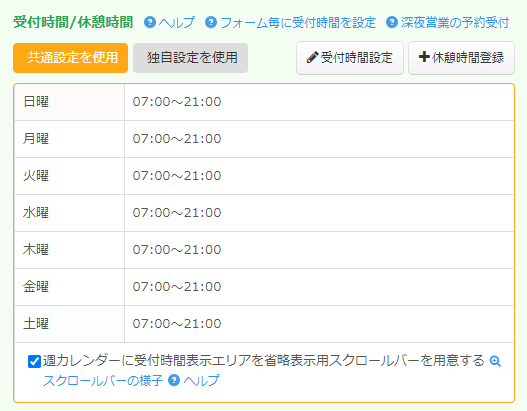 独自設定はそのフォームだけ適用する受付時間・休憩時間の設定が可能です。