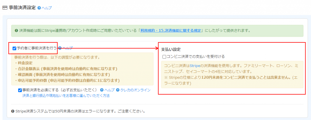 SelectTypeの予約システムの事前決済設定では、コンビニ支払いにも対応しています。
