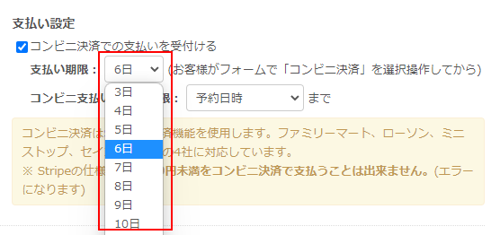 このようにSelectTypeの予約システムではコンビニ決済の支払い期限の設定が可能です。