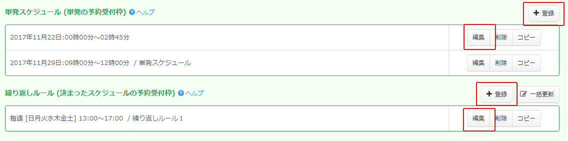 単発スケジュール、繰返しルールの設定画面を表示します。