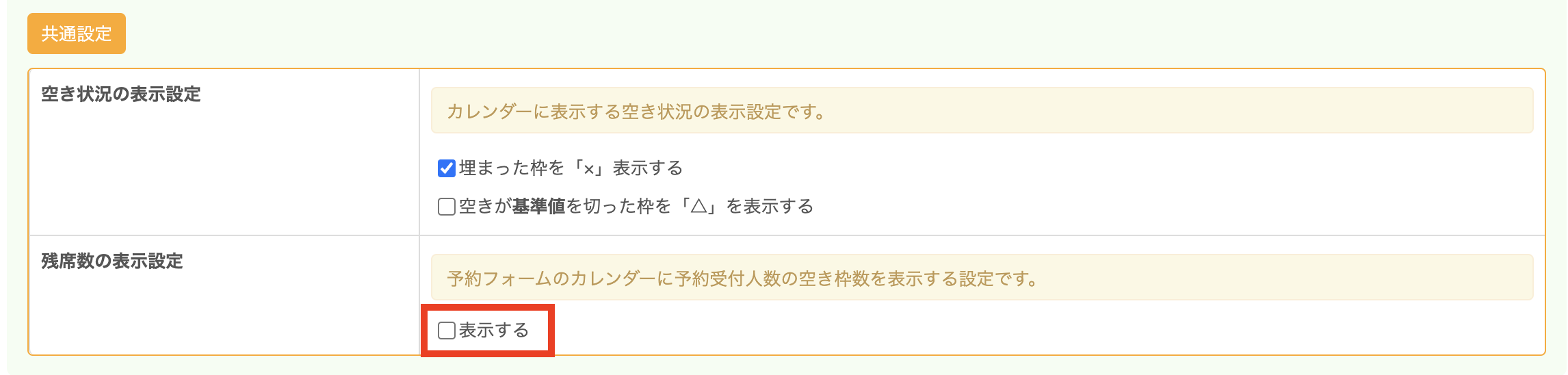 「残席数の表示設定」の「表示する」をクリックするとチェックが外れ、予約カレンダー上に残枠が表示されなくなります。