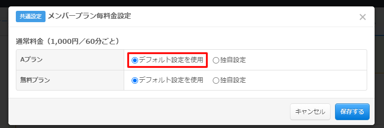 「デフォルト設定を使用」を指定すると親画面で設定されている通常料金の設定が反映されます。
