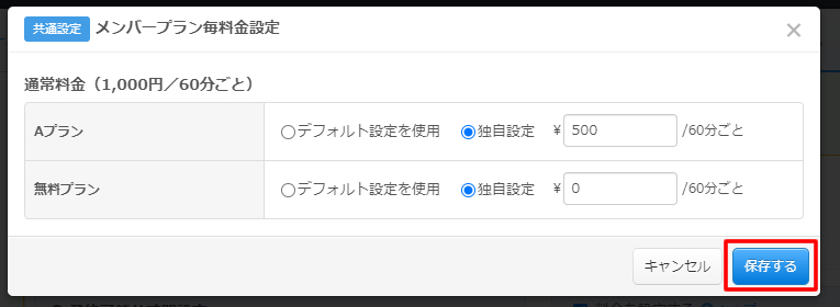メンバープラン毎料金設定画面が表示されます。