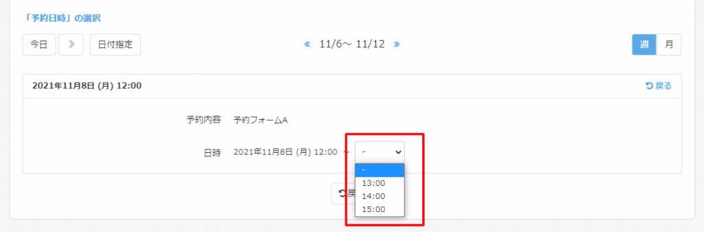 終了時間の選択肢は予約受付可能な時間のみ表示されるよう制御されます。