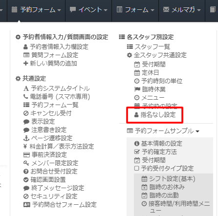 ページ上部ヘッダーより「予約フォーム」→「各スタッフ別設定/ 全スタッフ共通設定」→「指名なし設定」をクリックします。