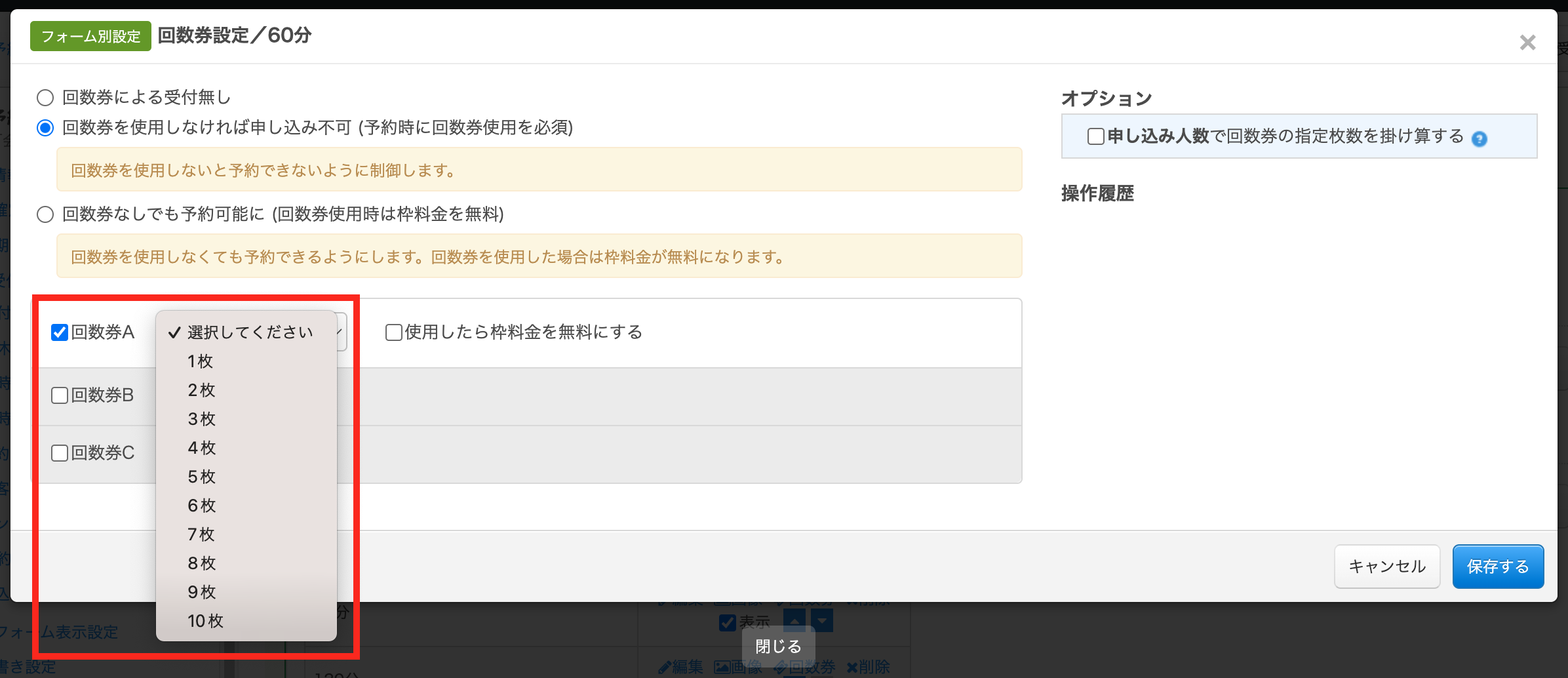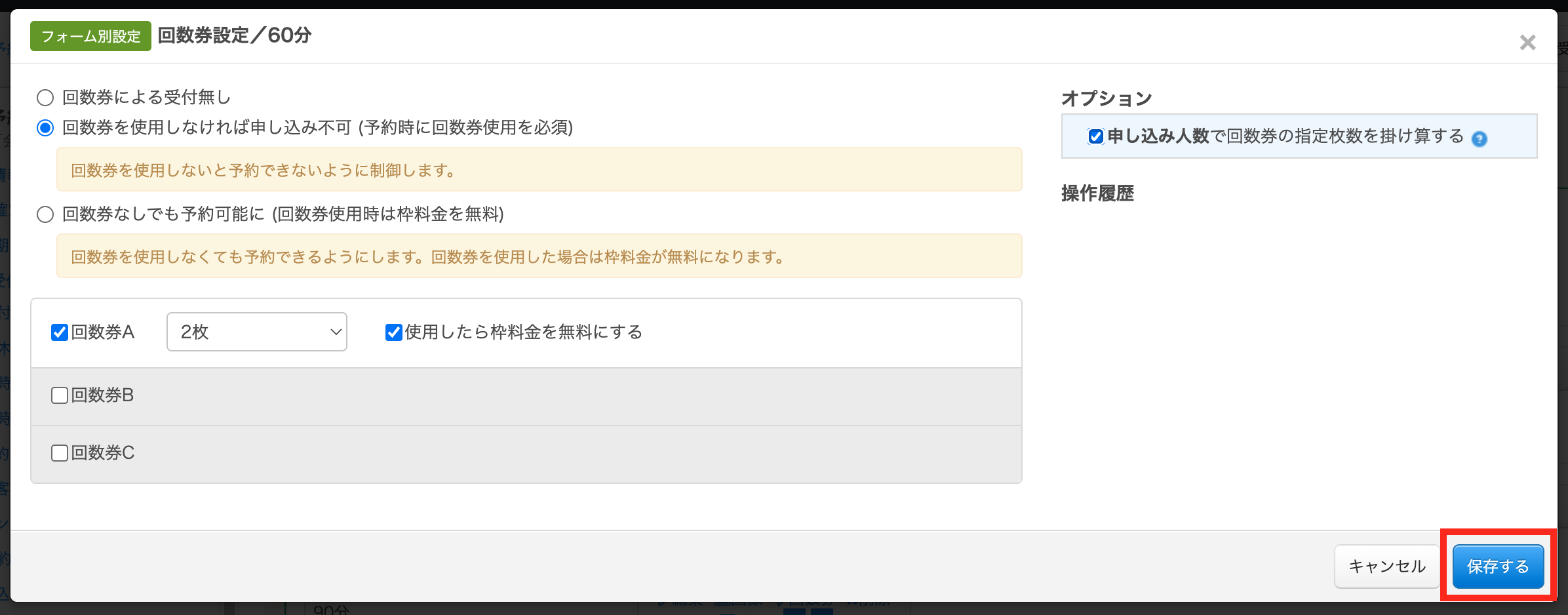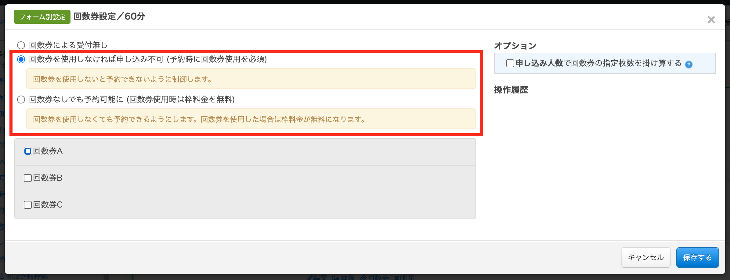 「回数券を使用しなければ申し込み不可 (予約時に回数券使用を必須)」もしくは、「 回数券なしでも予約可能に (回数券使用時は枠料金を無料)」を選択します。