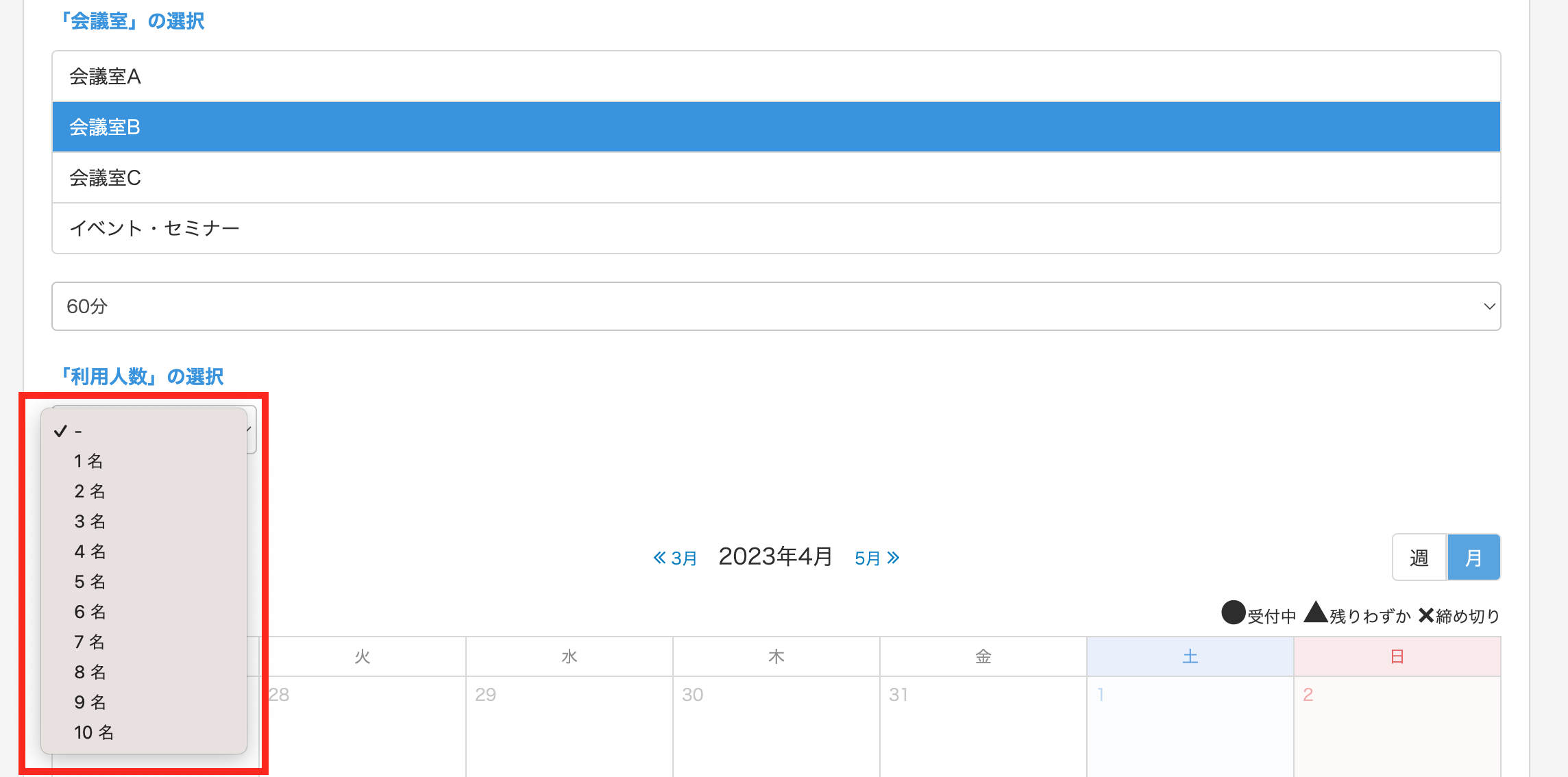 オプションの「申し込み人数で回数券の指定枚数を掛け算する 」にチェックを入れると、申込み人数に応じて予約に必要な回数券の枚数が自動的に計算され、予約を行えます。