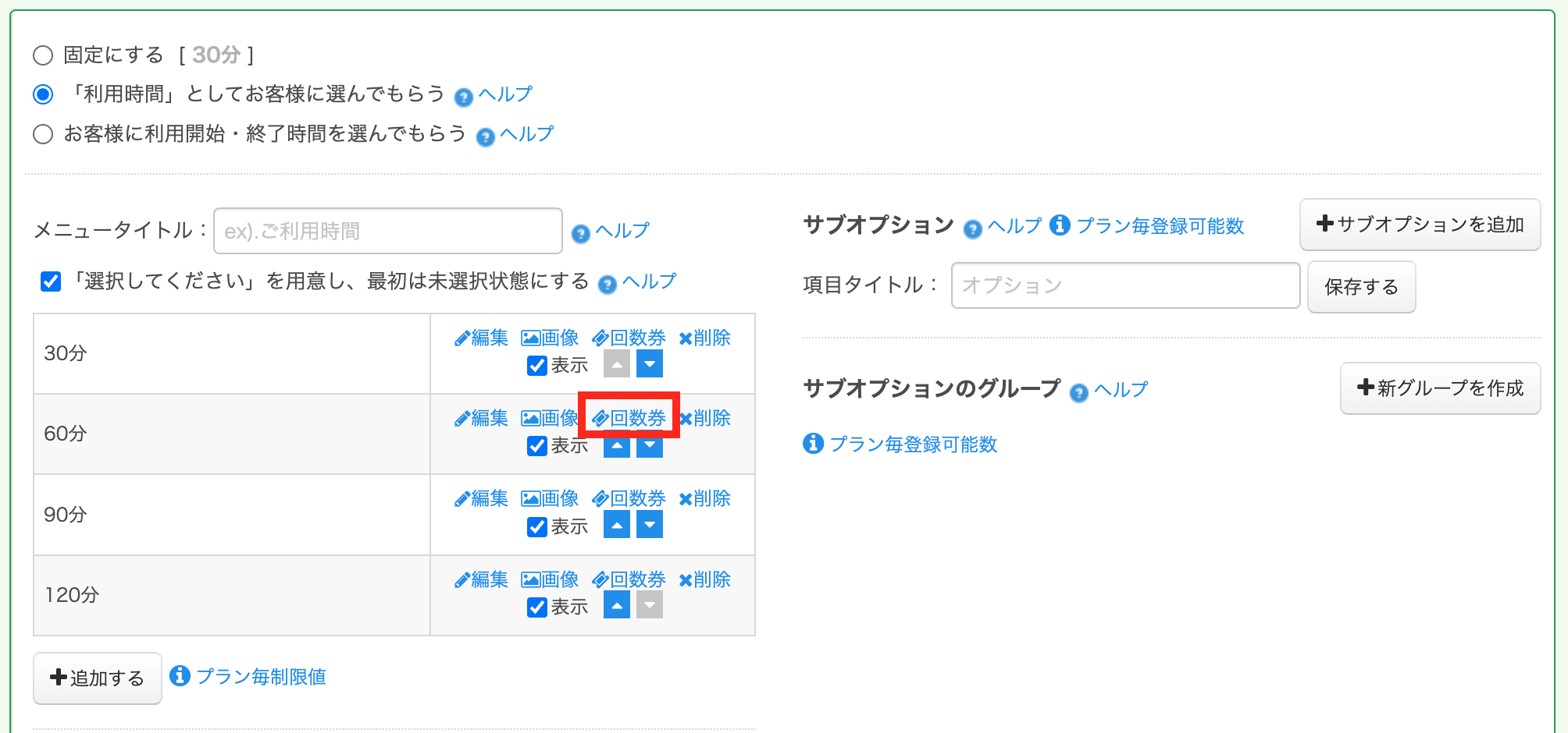 回数券を設定したい接客時間/利用時間の「回数券」をクリックします。