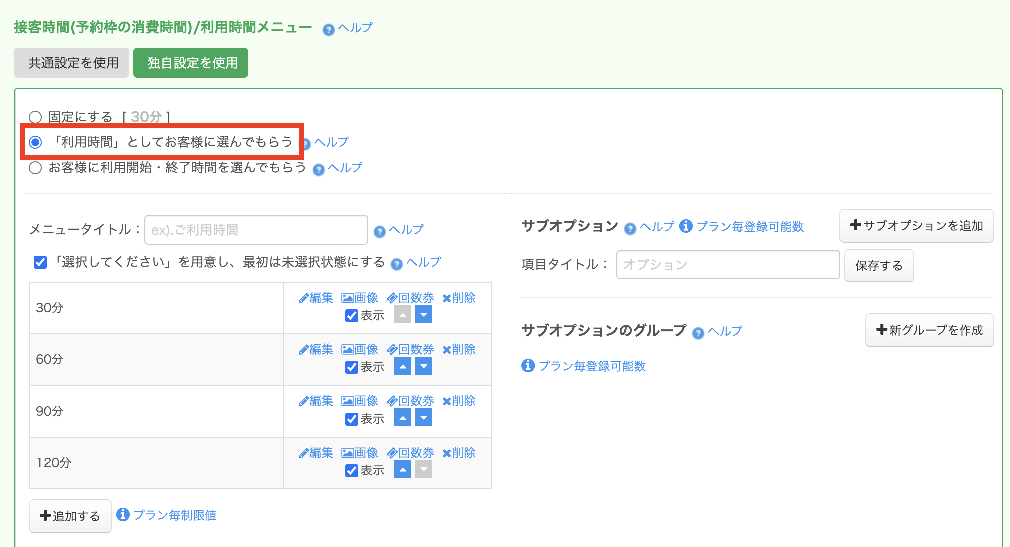 お客様にご利用時間を選んでもらう / 利用時間メニューの設定(営業時間タイプ)