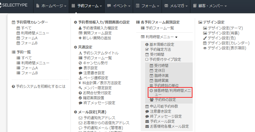 これらの設定は、「利用時間メニュー」を設定することにより予約フォームに表示されます。