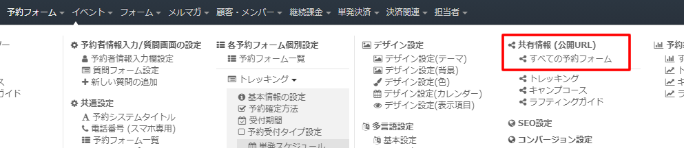 SELECTTYPEにログインしたら、ページ上部ヘッダーより「予約フォーム」→「共有情報(公開URL)」をクリックします。