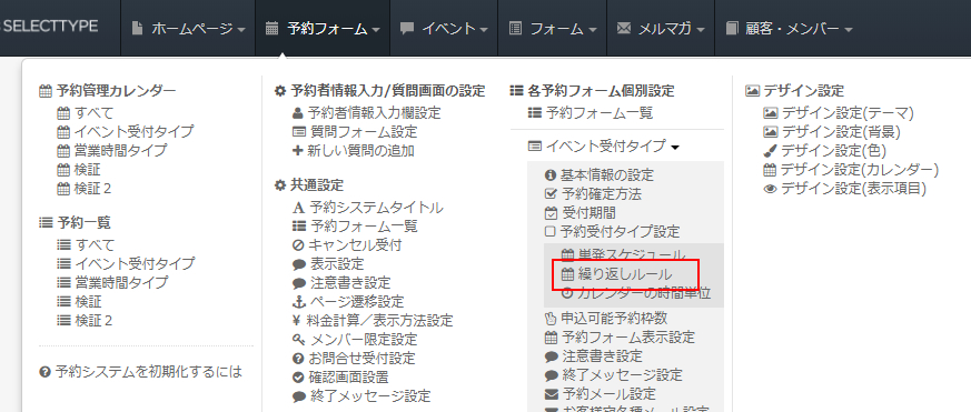 SELECTTYPEの予約システムで、「繰返しルール」はイベント受付タイプの予約フォームに、決まった規則で毎回繰り返される受付枠を作成、設置するものです。