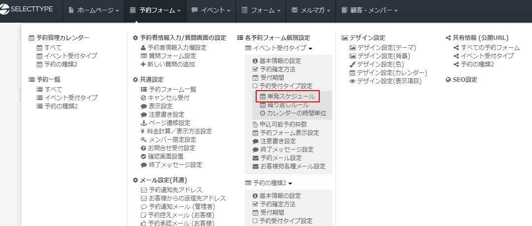 このようにその日時限りの予約受付枠をSELECTTYPEの予約フォームに作成する「単発スケジュール」の設定方法をご案内します。