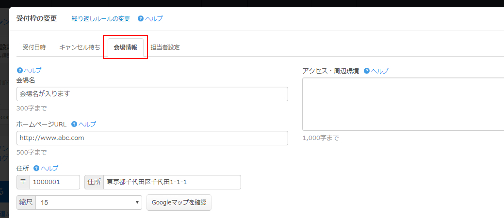 会場情報の設定フォームでは、会場名や住所(住所の情報はGoogle Mapに連動します)から会場ホームページ情報まで登録出来ます。