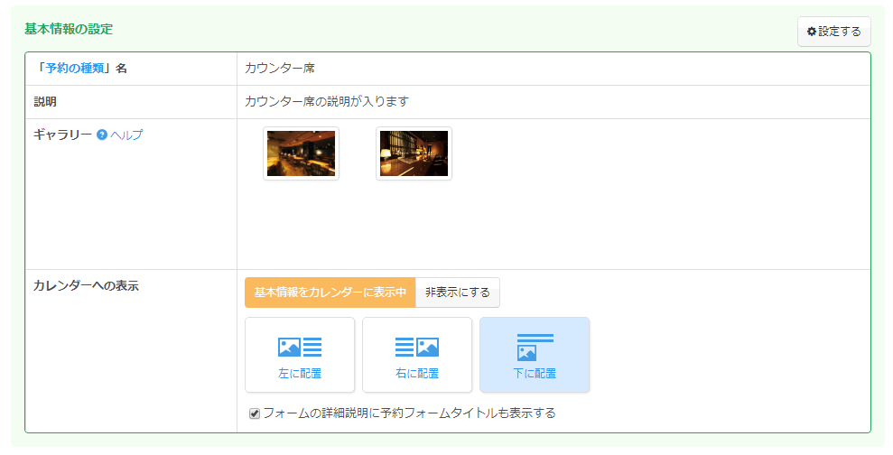 最後に予約フォームの基本情報設定欄に戻り、カレンダー画面に表示する指定をします。